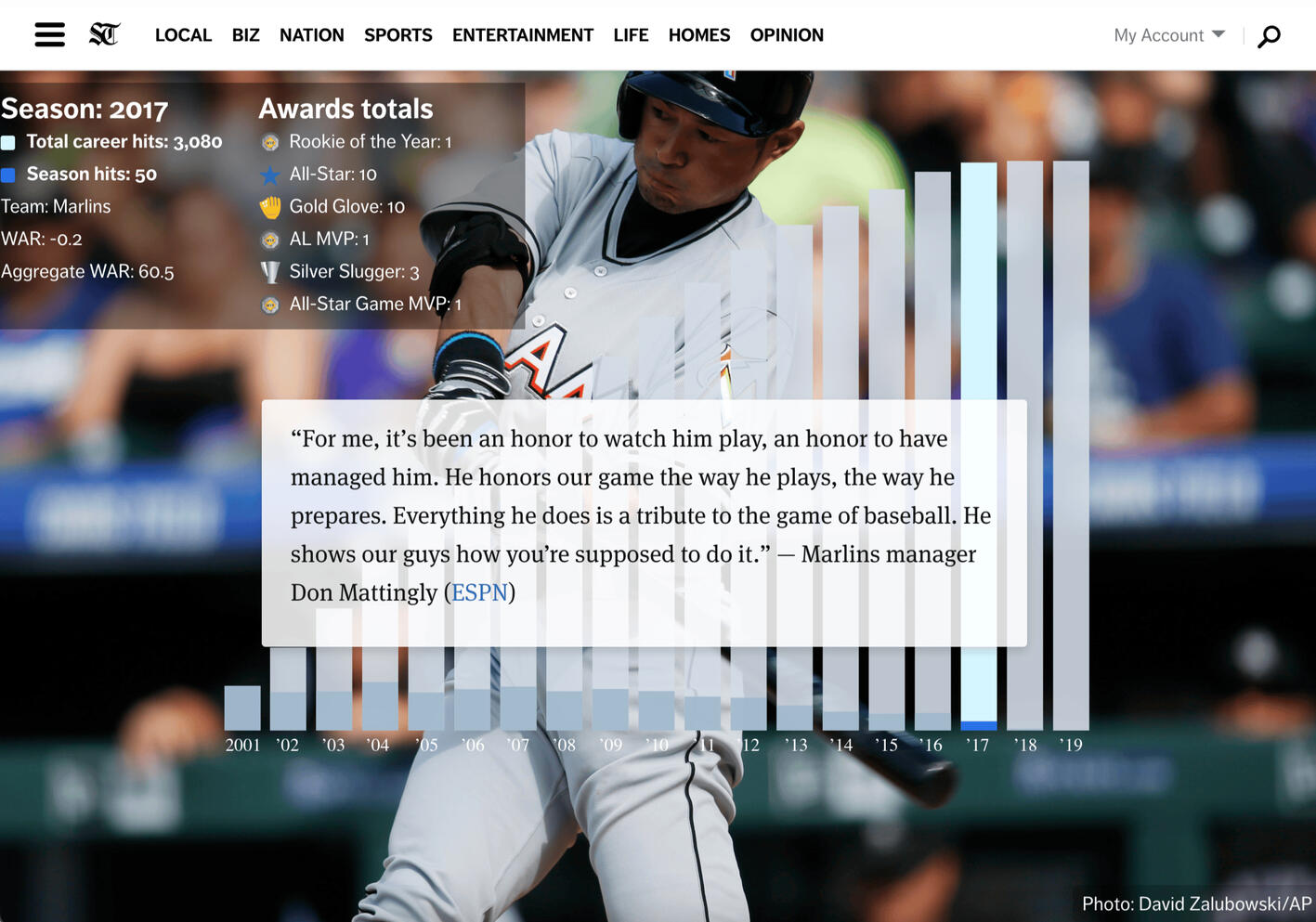 I developed this interactive story to illustrate the career highlights of Seattle baseball legend Ichiro Suzuki, using HTML/CSS and JavaScript. As the reader scrolls, each year of the graph becomes highlighted, the stats box updates, and the text blocks provide context about that year.